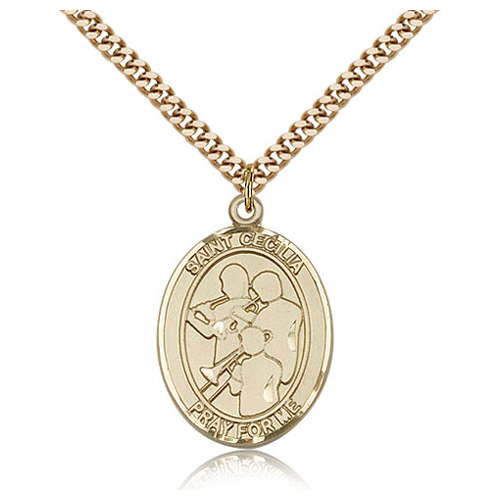Gold filled Saint Cecilia band medal dangles from a 24-inch stainless steel, endless heavy curb chain with gold plating. Dimensions: 1in x 3/4in. This item is the size of a quarter. Die struck, hand-engraved medal. Inscription: SAINT CECILIA PRAY FOR ME. Made in USA.