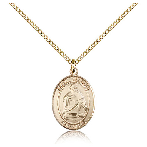 This oval St Charles medal is made of gold filled sterling silver. 18-inch gold-plated sterling silver lite curb chain with lobster clasp. Dimensions: 3/4in x 1/2in. This item is the size of a penny. Die struck, hand-engraved medal. Inscription: SAINT CHARLES PRAY FOR US. Made in USA.