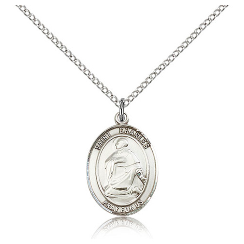 This oval sterling silver St Charles medal dangles from an 18-inch sterling silver lite curb chain with lobster clasp. Dimensions: 3/4in x 1/2in. This item is the size of a penny. Inscription: SAINT CHARLES PRAY FOR US. Made in USA.