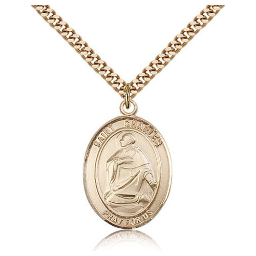 This men's St Charles medal is made of gold filled sterling silver. Inscription: SAINT CHARLES PRAY FOR US. 24-inch stainless steel, endless heavy curb chain with gold plating. Dimensions: 1in x 3/4in. This item is the size of a quarter. Die struck, hand-engraved. Made in USA.