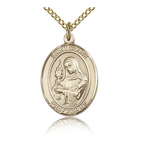 Die struck, hand-engraved oval St Clare medal is made of gold-plated sterling silver. 18-inch sterling silver lite curb chain with lobster clasp. Dimensions: 3/4in x 1/2in. This item is the size of a penny. Inscription: SAINT CLARE PRAY FOR US. Made in USA.