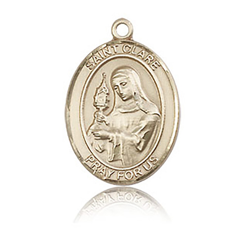 Die struck, hand-engraved medal is made of polished, solid 14kt yellow gold. Inscription: SAINT CLARE PRAY FOR US. Dimensions: 3/4in x 1/2in. This item is the size of a penny. Made in USA.