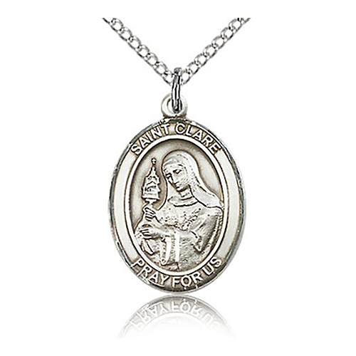 This oval sterling silver St Clare medal has the inscription: SAINT CLARE PRAY FOR US. 18-inch sterling silver lite curb chain with lobster clasp. Dimensions: 3/4in x 1/2in. This item is the size of a penny. Die struck, hand-engraved. Made in USA.