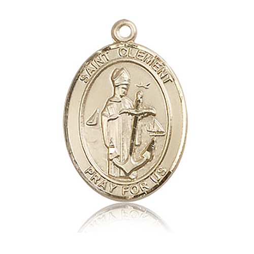 Die struck, hand-engraved St Clement medal is made of polished, solid 14k yellow gold. Inscription: SAINT CLEMENT PRAY FOR US. Dimensions: 1in x 3/4in. This item is the size of a quarter. Made in USA.