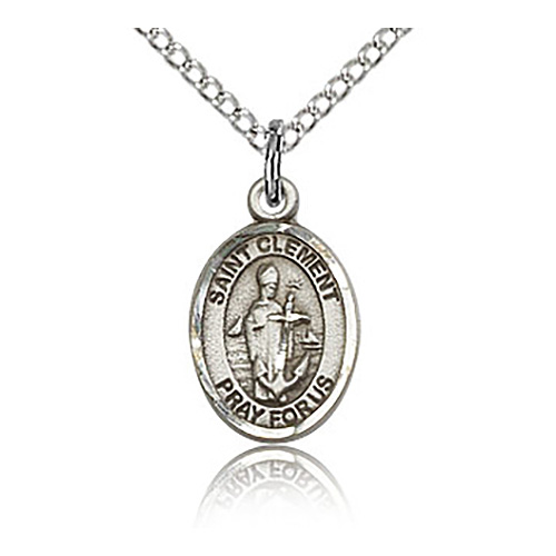 Die struck, hand-engraved St Clement charm is made of sterling silver. Free 18-inch sterling silver lite curb chain with lobster clasp. Plain back. Dimensions: 1/2in x 1/4in. This item is half the height of a quarter. Made in USA.