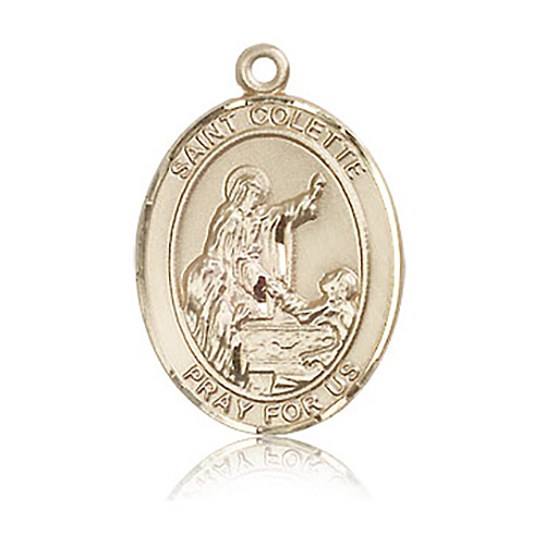 Die struck, hand-engraved St Colette medal is made of polished, solid 14k yellow gold. Inscription: SAINT COLETTE PRAY FOR US. Dimensions: 1in x 3/4in. This item is the size of a quarter. Made in USA.