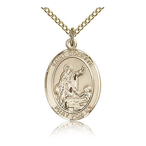 This oval St. Colette medal is made of gold filled sterling silver. Die struck, hand-engraved medal. Inscription: SAINT COLETTE PRAY FOR US. Gold-plated sterling silver 18-inch curb chain has a lobster clasp. Dimensions: 3/4in x 1/2in. This item is the size of a penny. Made in USA.