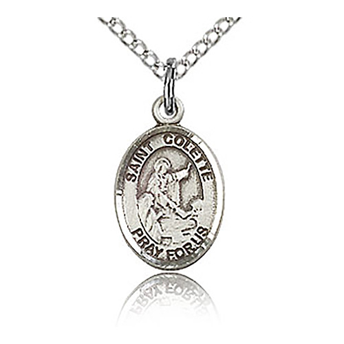 This small sterling silver St Colette charm dangles from a sterling silver 18in lite curb chain with lobster clasp. Inscription: SAINT COLETTE PRAY FOR US. Plain back. Dimensions: 1/2in tall x 1/4in wide. Die struck, hand-engraved. Made in USA.