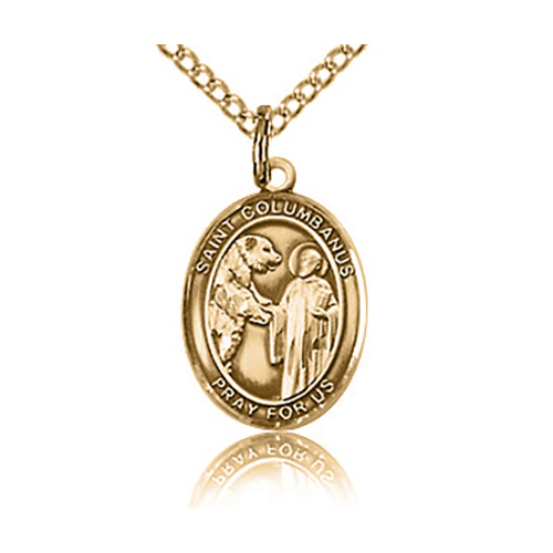 Die struck, hand-engraved St Columbanus charm is made of gold filled sterling silver. Gold plated, sterling silver 18-inch curb chain has a lobster clasp. Plain back. Dimensions: 1/2in x 1/4in. This item is half the size of a quarter. Made in USA.
