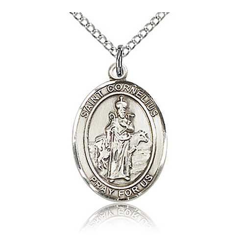 This sterling silver St Cornelius medal dangles from a sterling silver 18in lite curb chain with lobster clasp. Dimensions: 3/4in x 1/2in. This item is the size of a penny. Die struck, hand-engraved medal. Inscription: SAINT CORNELIUS PRAY FOR US. Made in USA.