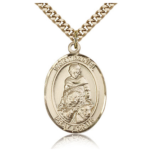 Gold filled sterling silver oval St Daniel medal dangles from a 24-inch stainless steel, endless heavy curb chain with gold plating. Die struck, hand-engraved. Inscription: SAINT DANIEL PRAY FOR US. Dimensions: 1in x 3/4in. This item is the size of a quarter. Made in USA.