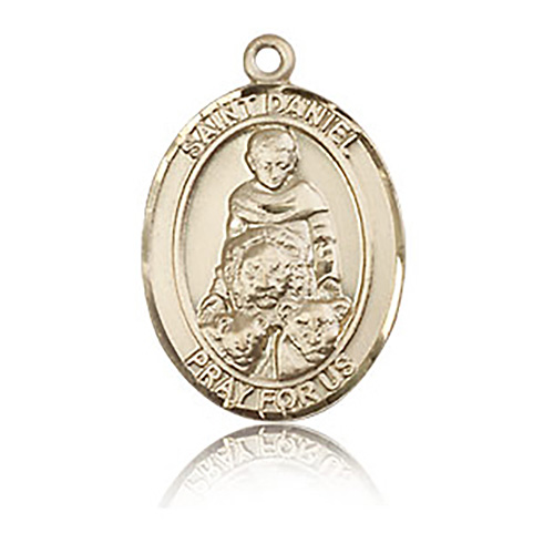 This ladies' 14k yellow gold oval St Daniel medal is die struck and hand-engraved. Inscription: SAINT DANIEL PRAY FOR US. Dimensions: 3/4in x 1/2in. This item is the size of a penny. Made in USA.