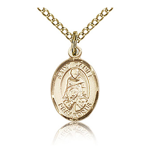 Die struck, hand-engraved St Daniel charm. Free 18-inch gold plated, sterling silver lite curb chain with lobster clasp. Plain back. Dimensions: 1/2in x 1/4in. This item is half the size of a quarter. Made in USA.