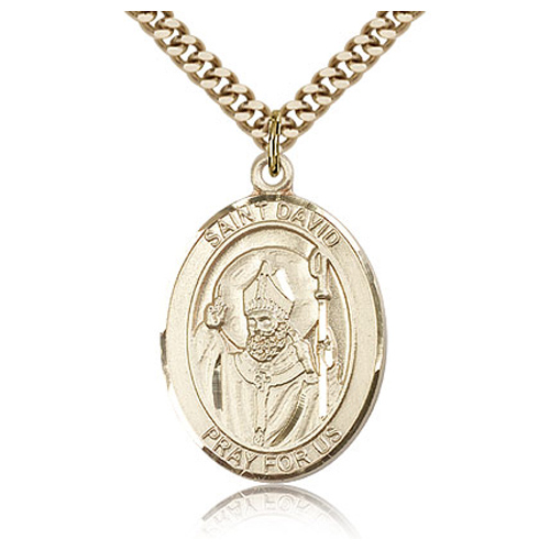 Gold filled oval St David medal is die struck and hand-engraved. Inscription: SAINT DAVID PRAY FOR US. 24-inch stainless steel, endless heavy curb chain with gold plating. Dimensions: 1in x 3/4in. This item is the size of a quarter. Made in USA.