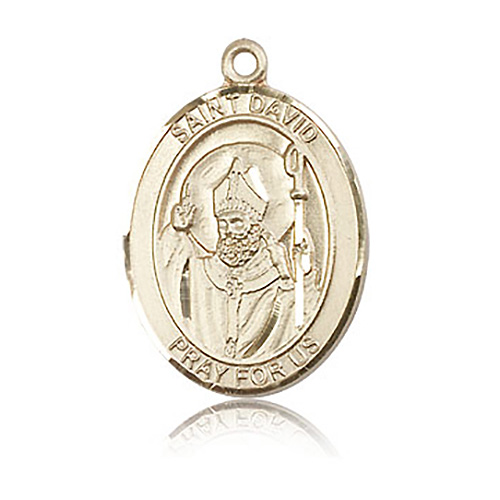 Die struck, hand-engraved medal is made of polished, solid 14kt yellow gold. Inscription: SAINT DAVID PRAY FOR US. Dimensions: 1in x 3/4in. This item is the size of a quarter. Made in USA.