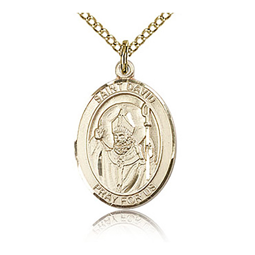 Gold filled St David medal is die struck and hand-engraved. 18-inch sterling silver lite curb chain with lobster clasp. Dimensions: 3/4in x 1/2in. This item is the size of a penny. Inscription: SAINT DAVID PRAY FOR US. Made in USA.