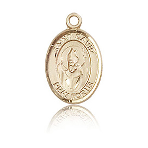 This very small oval St. David medal is made of polished, solid 14k yellow gold. Inscription: SAINT DAVID PRAY FOR US. Dimensions: 1/2in x 1/4in. This item is half the size of a quarter. Die struck, hand-engraved. Made in USA.