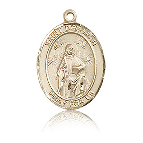 This ladies' 14k yellow gold oval St Deborah medal is die struck and hand-engraved. Inscription: SAINT DEBORAH PRAY FOR US. Dimensions: 3/4in x 1/2in. This item is the size of a penny. Made in USA.