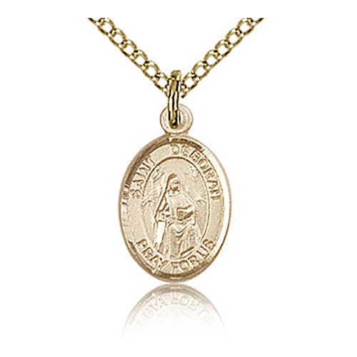 Die struck, hand-engraved St Deborah charm is made of gold filled sterling silver. 18-inch gold plated, sterling silver lite curb chain with lobster clasp. Plain back. Dimensions: 1/2in x 1/4in. This item is half the height of a quarter. Made in USA.