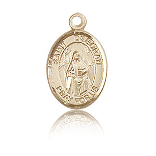 This very small St Deborah medal is made of polished, solid 14kt yellow gold. Inscription: SAINT DEBORAH PRAY FOR US. Dimensions: 1/2in x 1/4in. This item is half the height of a quarter. Die struck, hand-engraved. Made in USA.