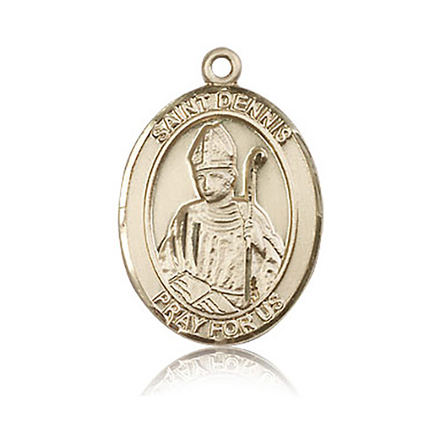 Die struck, hand-engraved medal is made of polished, solid 14kt yellow gold. Inscription: SAINT DENNIS PRAY FOR US. Dimensions: 1in x 3/4in. This item is the size of a quarter. Made in USA.