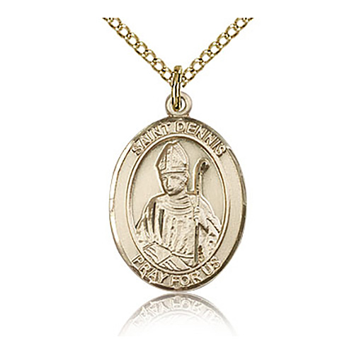 This oval St. Dennis medal is made of gold filled sterling silver. Inscription: SAINT DENNIS PRAY FOR US. 18-inch gold-plated sterling silver lite curb chain with lobster clasp. Dimensions: 3/4in x 1/2in. This item is the size of a penny. Made in USA.