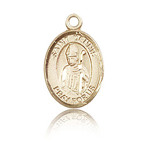 This very small Saint Dennis medal is made of polished, solid 14kt yellow gold. Inscription: SAINT DENNIS PRAY FOR US. Dimensions: 1/2in x 1/4in. This item is half the height of a quarter. Die struck, hand-engraved medal is made in USA.