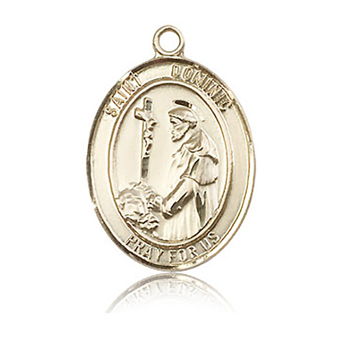 Die struck, hand-engraved medal is made of polished, solid 14kt yellow gold. Inscription: SAINT DOMINIC PRAY FOR US. Dimensions: 1in x 3/4in. This item is the size of a quarter. Made in USA.