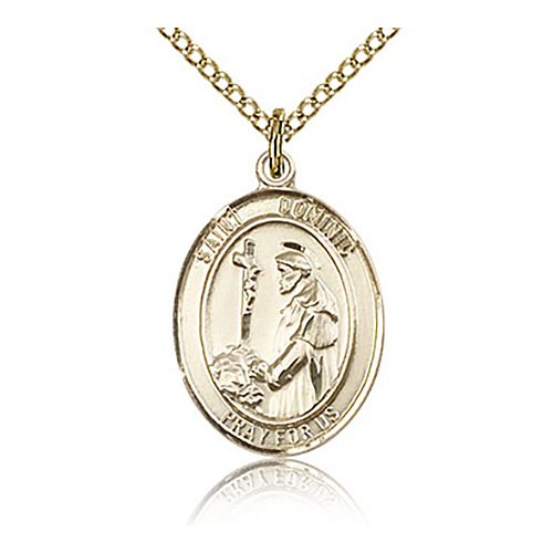 Gold filled oval St Dominic medal dangles from an 18-inch gold plated sterling silver lite curb chain with lobster clasp. Dimensions: 3/4in x 1/2in. This item is the size of a penny. Inscription: SAINT DOMINIC PRAY FOR US. Made in USA. Die struck, hand-engraved medal.
