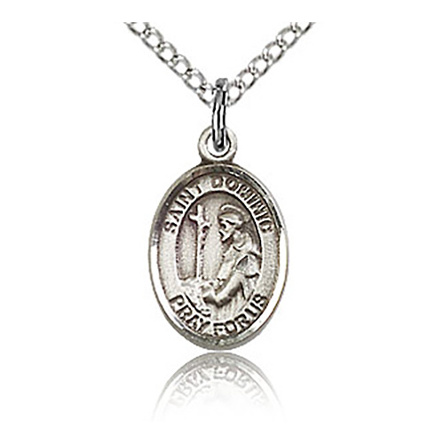 This small oval sterling silver St Dominic charm dangles from a sterling silver 18-inch lite curb chain with lobster clasp. Item height: 1/2in. This medal is half the height of a quarter. Plain back. Made in USA.