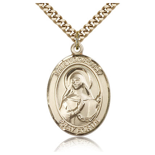 Gold filled oval St Dorothy medal dangles from a 24-inch stainless steel, endless heavy curb chain with gold plating. Medal size: 1in x 7/8in. This item is the size of a quarter. Die struck, hand-engraved medal. Inscription: SAINT DOROTHY PRAY FOR US. Made in USA.
