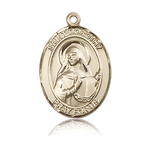 Die struck, hand-engraved oval St Dorothy medal is made of polished, solid 14kt yellow gold. Inscription: SAINT DOROTHY PRAY FOR US. Dimensions: 1in x 3/4in. This item is the size of a quarter. Made in USA.