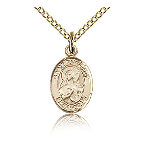This very small oval St Dorothy charm is made of gold filled sterling silver. 18-inch gold plated, sterling silver lite curb chain with lobster clasp. Dimensions: 1/2in x 1/4in. This item is half the height of a quarter. Plain back. Made in USA.
