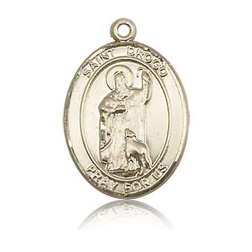 Die struck, hand-engraved St Drogo medal is made of polished solid 14k yellow gold. Inscription: SAINT DROGO PRAY FOR US. Dimensions: 1in x 3/4in. This item is the size of a quarter. Made in USA.