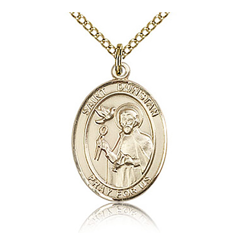 This oval St Dunstan medal is made of gold-filled sterling silver. Gold-plated sterling silver 18in lite curb chain with lobster clasp. Dimensions: 3/4in x 1/2in. Inscription: SAINT DUNSTAN PRAY FOR US. Made in USA.