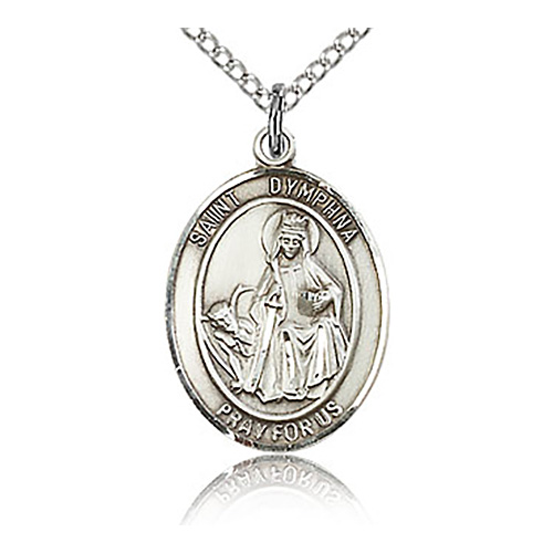 Sterling silver oval St Dymphna medal dangles from an 18-inch sterling silver lite curb chain with lobster clasp. Dimensions: 3/4in x 1/2in. Inscription: SAINT DYMPHNA PRAY FOR US. This item is the size of a penny. Die struck, hand-engraved medal. Made in USA.