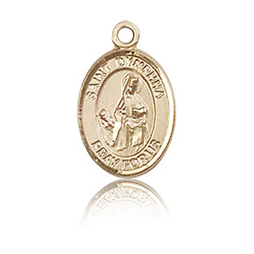 Die struck, hand-engraved medal is made of polished, solid 14kt yellow gold. Inscription: SAINT DYMPHNA PRAY FOR US. Dimensions: 1/2in x 1/4in. This item is half the height of a quarter. Made in USA.