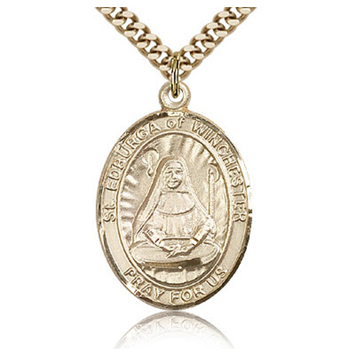 Gold filled sterling silver oval St Edburga medal dangles from a 24-inch stainless steel, endless heavy curb chain with gold plating. Die struck, hand-engraved. Inscription: SAINT EDBURGA PRAY FOR US. Dimensions: 1in x 3/4in. This item is the size of a quarter. Made in USA.