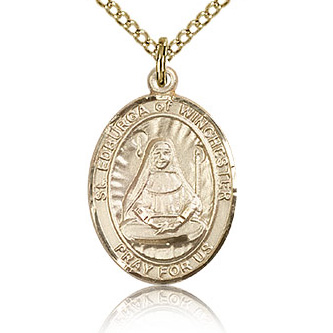 This oval Saint Edburga medal is made of gold-filled sterling silver. Gold-plated sterling silver 18in lite curb chain has a lobster clasp. Dimensions: 3/4in x 1/2in. This item is the size of a penny. Inscription: SAINT EDBURGA PRAY FOR US. Made in USA.