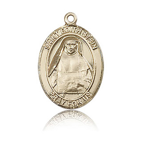 This oval Saint Edith medal is made of 14k yellow gold. Dimensions: 3/4in x 1/2in. This item is the size of a penny. Inscription: SAINT EDITH PRAY FOR US. Made in USA.