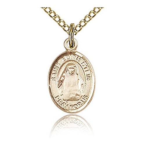 This small St Edith charm is made of gold filled sterling silver. 18-inch gold plated, sterling silver lite curb chain with lobster clasp. Plain back. Dimensions: 1/2in x 1/4in. This item is half the height of a quarter. Die struck, hand-engraved. Made in USA.