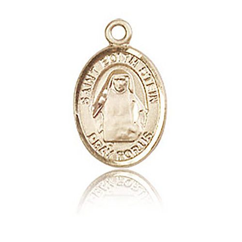 This very small St Edith medal is made of polished, solid 14k yellow gold. Inscription: SAINT EDITH PRAY FOR US. Dimensions: 1/2in x 1/4in. This item is half the height of a quarter. Made in USA.