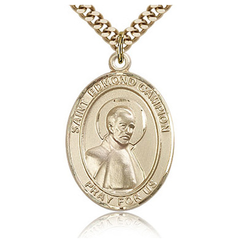 Gold filled sterling silver oval St Edmund medal dangles from a 24-inch stainless steel, endless heavy curb chain with gold plating.Die struck, hand-engraved. Inscription: SAINT EDMUND PRAY FOR US. Dimensions: 1in x 3/4in. This item is the size of a quarter. Made in USA.