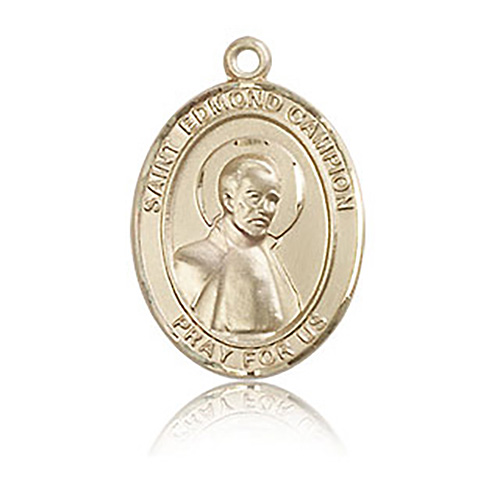 Die struck, hand-engraved medal is made of polished, solid 14kt yellow gold. Inscription: SAINT EDMUND PRAY FOR US. Dimensions: 3/4in x 1/2in. This item is the size of a penny. Made in USA.