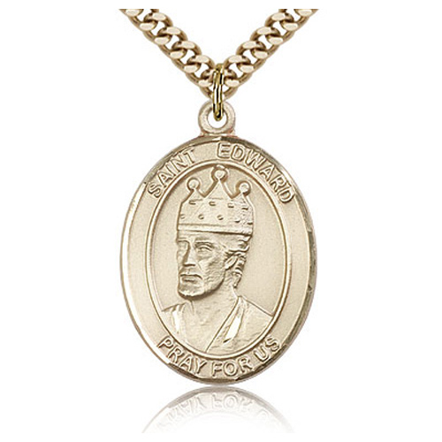 Gold filled sterling silver oval St Edward medal dangles from a 24-inch stainless steel, endless heavy curb chain with gold plating. Die struck, hand-engraved. Inscription: SAINT EDWARD PRAY FOR US. Dimensions: 1in x 3/4in. This item is the size of a quarter. Made in USA.