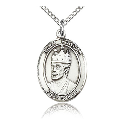 This 3/4 inch Saint Edward silver medal is die struck, hand-engraved medal. Inscription: SAINT EDWARD PRAY FOR US. Free 18-inch sterling silver lite curb chain with lobster clasp. Dimensions: 3/4in x 1/2in. This item is the size of a penny. Made in USA.