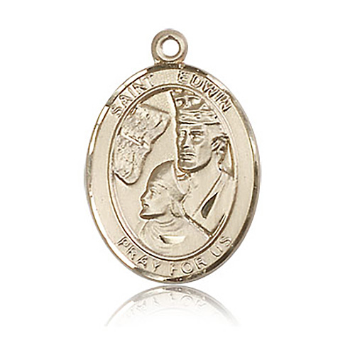 Die struck, hand-engraved St Edwin medal is made of polished, solid 14k yellow gold. Inscription: SAINT EDWIN PRAY FOR US. Dimensions: 1in x 3/4in. This item is the size of a quarter. Made in USA.