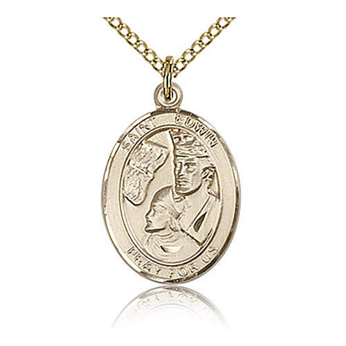 This 3/4 inch Saint Edwin medal is die struck, hand-engraved medal. Inscription: SAINT EDWIN PRAY FOR US. Free 18-inch sterling silver lite curb chain with lobster clasp. Dimensions: 3/4in x 1/2in. This item is the size of a penny. Made in USA.