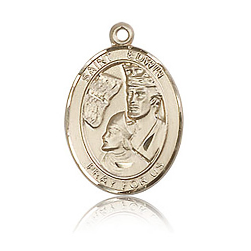 Die struck, hand-engraved medal is made of polished, solid 14kt yellow gold. Inscription: SAINT EDWIN PRAY FOR US. Dimensions: 3/4in x 1/2in. This item is the size of a penny. Made in USA.