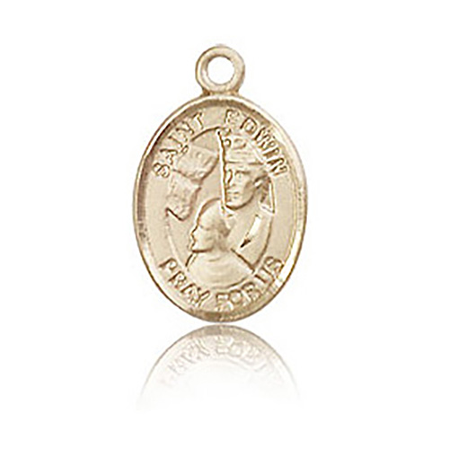 This small oval St Edwin medal is made of solid 14k yellow gold. Inscription: SAINT EDWIN PRAY FOR US. Dimensions: 1/2in x 1/4in. This item is half the height of a quarter. Die struck, hand-engraved. Made in USA.